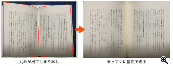今回のバージョンでは、開いた書籍の曲面の補正にも対応。本の湾曲に合わせて範囲を設定するとキレイな四角形へと補正でき、対象は右ページ/左ページ/見開きの2ページと選択できる。そのほか、歪みの補正を行わなくてもフィルタの機能を単独で使えるようになり、色調を補正するソフトとしても活用できるようになった。また、補正画面に方眼を表示する「グリッド表示」機能も実装されており、四隅の縦横をきれいに調整するのに役立てることができる。