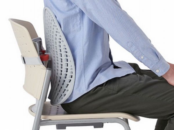 イスの背もたれにバンドで固定し座ると、人間工学に基づいたバックサポートが背中と腰をしっかりホールドしてくれて、正しい姿勢キープと、背中にかかる圧力分散に役立つ。