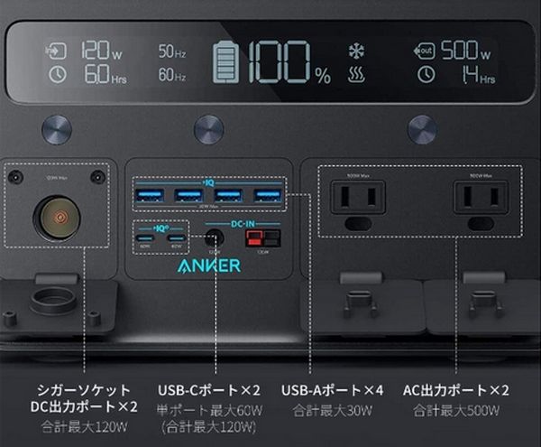216,000mAh(778Wh)の大容量を誇り、2つのACポート(合計最大500W出力)からは小型冷蔵庫や電気毛布など、2つの小型家電に同時給電できる。