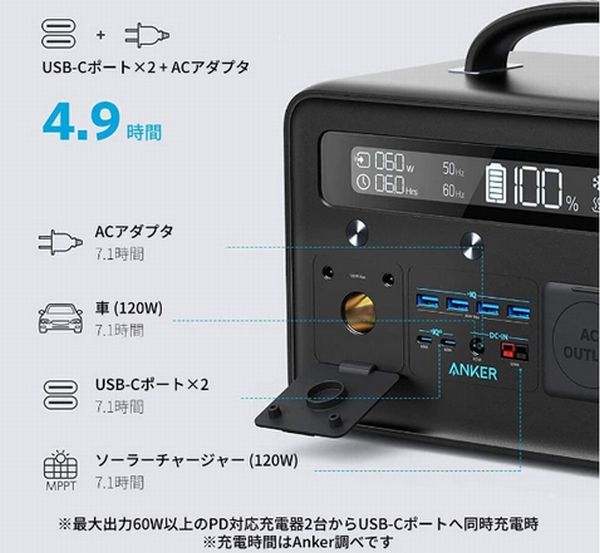 ポータブル電源本体の充電については、付属のACアダプタと2つのUSB-Cポートからの同時充電が可能で、5時間で本体の216,000mAhを満充電できる。
