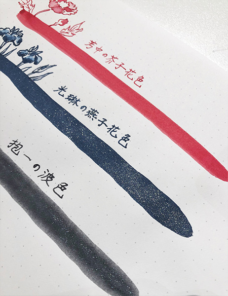 この「江戸色インク 第5弾 琳派の色」は、京都の文具・雑貨メーカーのTag Stationeryとのコラボレーションで実現された。尾形光琳の「燕子花図屏風」をイメージした群青をベースとしている「光琳の燕子花色」、中村芳中の「花卉図画帖」から「七月 芥子」の花びらをイメージした優しい朱色の「芳中の芥子の花色」、酒井抱一の「波図屏風」の波の色をイメージした濃淡のある灰色の「抱一の波色」という全3色のラインナップ。「光琳の燕子花色」と「抱一の波色」にはラメが入っており、作品の華やかさも表現されている。