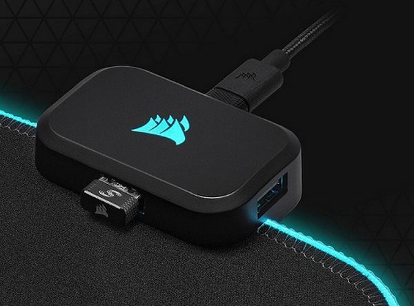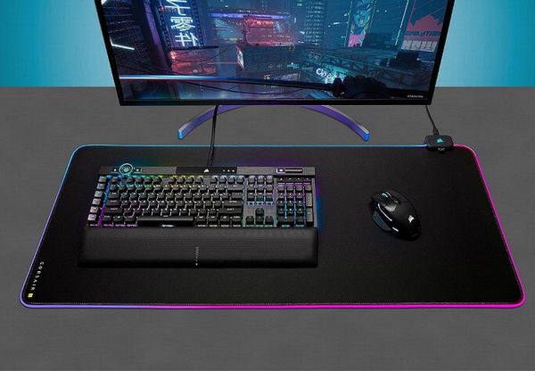 キーボードとマウスを載せてもまだ余裕があるサイズで、パッドのフチはパープルやイエロー、ブルーなど、12種類のプリセットライティングやiCUEによるフルコントロールで3ゾーン 360°RGBライティングに対応する。