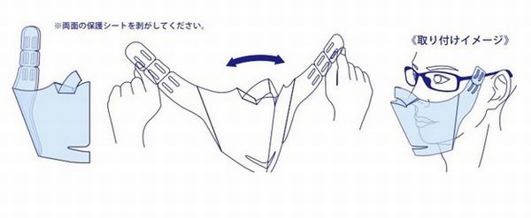 使用時はマスクの紐に設けられた穴(長さ・位置調整可能)にメガネのテンプル(つる)を差し込んで固定し、ずれにくくなっている。