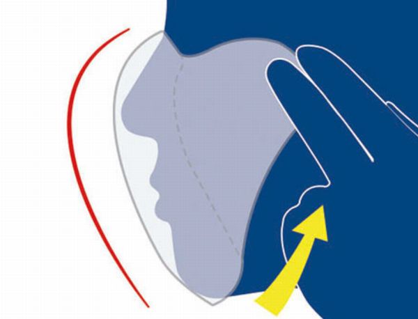 本製品は、マスクの端に粘着性のある医療用シリコンテープを採用し、頬骨あたり(目と耳の間)で顔に接着して使うマスク。