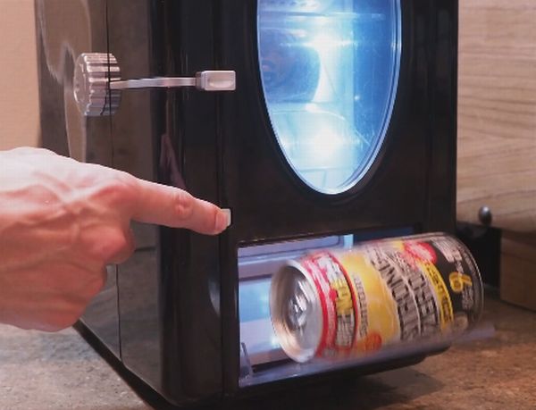 楕円形の透明窓で庫内が見えるようになっており、欲しいドリンクが収納されている段のボタンを押すとドリンクが下から出てくるという、自販機のようなギミックを搭載している。