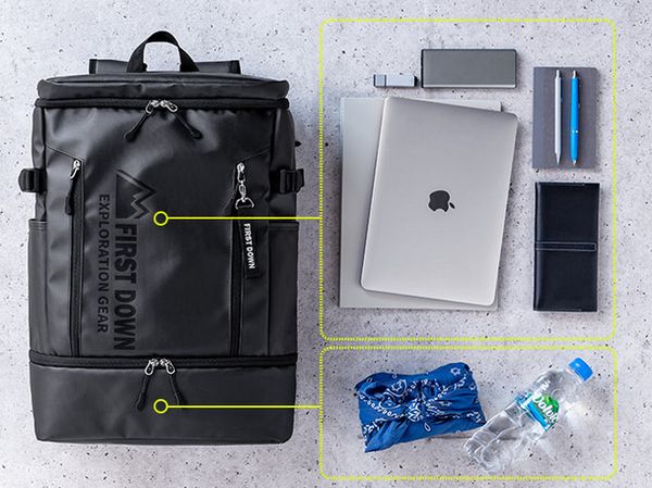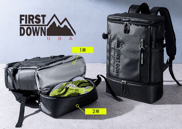 アメリカ発のアウトドアブランド「FIRST DOWN」が開発、デザインしたもので、バッグの収納スペースは大きめの上部と小さめの下部に分けられている。