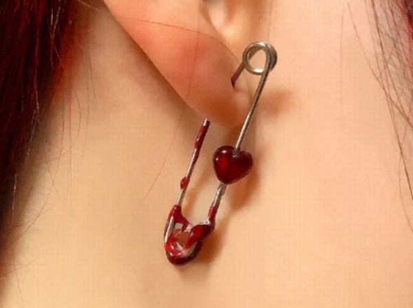 ピアスのように耳を貫いているのではなく、挟んでつけるイヤーカフにより、まるで安全ピンが耳に刺さっているように見える。