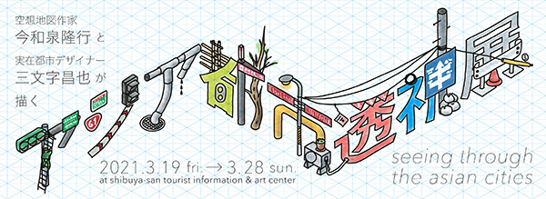 2021年3月19日(金)から3月28日(日)まで、shibuya-sanにて「空想地図作家・今和泉隆行と、実在都市デザイナー・三文字昌也が描くアジア都市透視展」の開催が予定されている。「都市透視図」のイラストを通じて、アジア都市の体験に迫る展示。空想の都市と実在の都市が交差するような試みとなる。