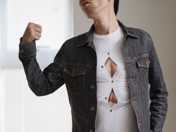 シャツがはちきれそうなほどのボディという妄想をシャツにプリントしたもので、たとえ平板な胸板でも、男性の場合は「タイトなシャツから逞しい肉体が露わになっている風」に、女性の場合は「タイトなシャツから豊かな胸元が露わになっている風」になり、ユニークなデザインで視線を集めることができる。
