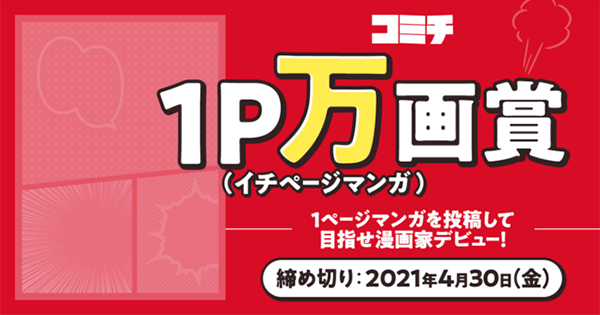 株式会社コミチは、1ページの漫画やイラストを募集する「1P万画賞」を開催中。2021年4月30日(金)まで、作品の応募を受け付けている。同社は、漫画家の“作る”や“広げる”や“稼ぐ”を支えるプラットフォーム「コミチ」を運営している会社。本コンテストは、「コミチ」での公式連載枠を獲得するため、まず1ページの漫画を投稿して制作の力試しをする賞として位置付けられている。