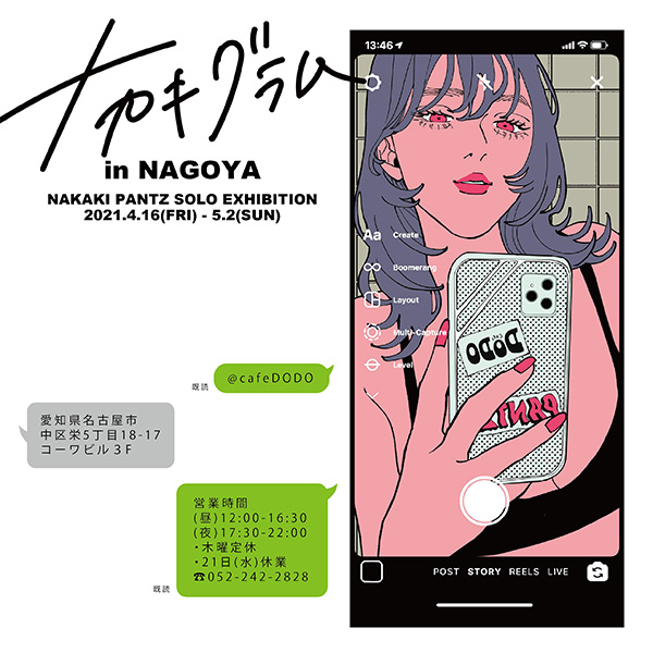 2021年5月2日(日)まで、cafe DODOにて、NAKAKI PANTZ(ナカキパンツ)氏の個展「ナカキグラム in NAGOYA」が開催されている。福岡県で開催された「ナカキグラム」の巡回展で、同氏にとって名古屋では初の個展となり、福岡県外でのソロ展示も初。入場無料だが、会場は飲食店であるため1オーダーが必要となる。毎週木曜および4月21日(水)は休業日で、営業時間は12:00~16:30/17:30~22:00。