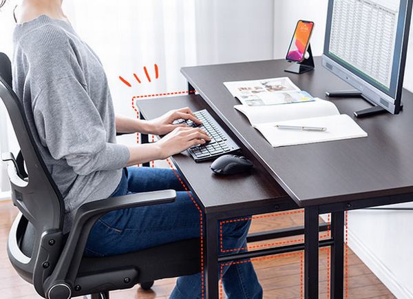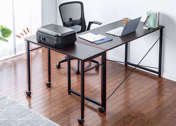 高さが64cmか70cmのデスクにくっつけることで、L字型デスクにしたり、ロングデスクにしたりして、作業スペースを広くしたり、追加のパソコン、プリンターなどを置くスペースを拡張できる。