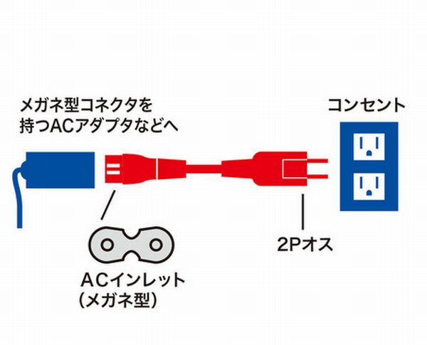 本製品は、ノートパソコンやパソコン周辺機器のACアダプタなどにある、メガネ型コネクタに対応する電源コード。