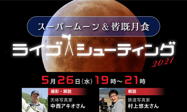 月が地球の影に全て入り込む「皆既月食」となるのは20:09過ぎとのこと。同社によるYouTubeのライブでは、配信中に天体写真家の中西アキオ氏が「皆既月食」を撮影することが予定されている。さらに、鉄道写真家の村上悠太氏も加わって、「月と鉄道」の作品を披露。ライブは雨天決行だが、放送内容は変更となる場合もある。