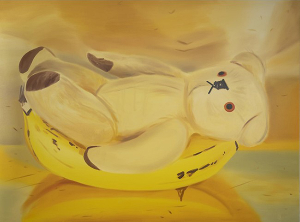 今井麗氏は、1982年神奈川県生まれの画家。2004年に多摩美術大学美術学部絵画科油画専攻を卒業し、2012年にシェル美術賞本江邦夫審査員奨励賞を受賞した。今井氏は、バナナの上に寝そべるクマの作品を描いたのを機に「等身大のモチーフを大きく引き伸ばして描いてみたいと思うようになった」とのことで、近年では大作も手掛けるようになっている。