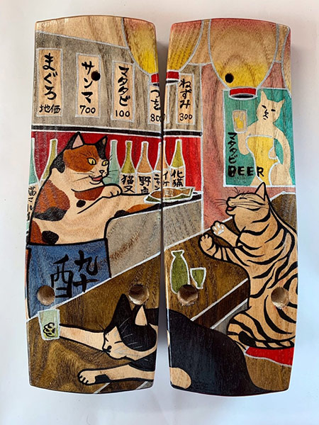 会場での下駄のオーダーでは、注文(購入)から完成品を受け取るまでの期間が約3カ月。オーダーを受け付けている下駄の例としては、「酔猫」「月下美人 白」「梵天の座」「盛々パンダ」などがあり、一般的な下駄とは一線を画した見映えのアイテムに仕上げられている。会期中には、鈴木千恵氏本人が毎日来場を予定。