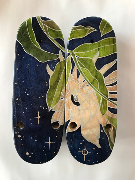 鈴木千恵氏による下駄は、左右の1対を2枚1点の絵画作品としてキャンバスに見立て、自由かつ独創的にデザインされていることが特徴。会場では、アクリル樹脂に金魚を合わせた透明感のある作品の「シンデレラ」、フルーツタルトを題材にした「ゲタルト」、花や動物を配置して側面を地層のようにしながら蟻と蟻穴まであるユニークな「ちきゅう」などの特別展示も行われる(非売品)。