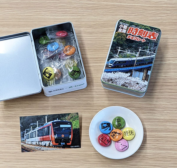 JR東日本商品化許諾済・交通新聞社商品化許諾済の本商品では、パッケージ缶の容器に小型全国時刻表の2021年4月号の表紙画像とロゴをプリント。“本物の時刻表”が再現された。中身はカラフルなチョコレートに“特急”や“寝台”や“指定席”などの時刻表記号をプリント。時刻表ユーザーや鉄道ファンはもちろん、普段は時刻表を使わない人でもポップなビジュアルで楽しむことができる。