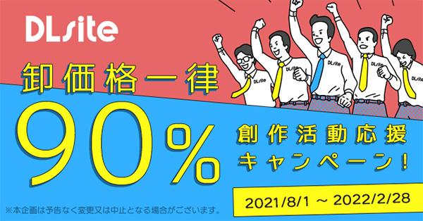 株式会社エイシスは、2021年8月1日(日)の0:00から2022年2月28日(月)の23:59まで、「DLsite 創作活動応援キャンペーン」を実施する(https://www.dlsite.com/modpub/lp/home/indies/)。「DLsite」は2次元コンテンツのダウンロード販売サービスで、今回のキャンペーンはクリエイターの応援を目的としたもの。期間内には対象作品の販売手数料が一律10%へと引き下げられ、売り上げの90%がクリエイターに支払われることとなる。