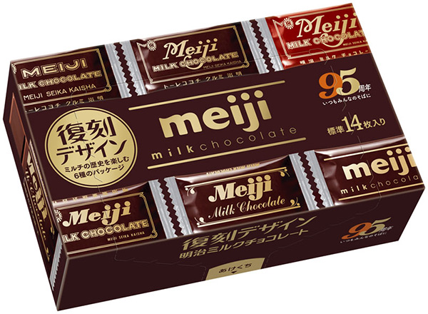 発売から現在までのデザインの変遷を楽しめる「明治ミルクチョコレート復刻版箱」が登場