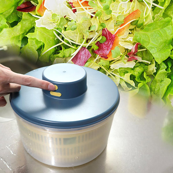 本製品は、ザルをセットしたボウルに野菜を入れて蓋をし、電源ボタンを押すと自動でザルが回転して水切りが行われる。「野菜の水を切ってシャキシャキのサラダが食べたい」「ドレッシングの量を減らしたい」「あらかじめしっかりと水を切ることで炒め物の油跳ねを防ぎたい」「ハンドル式やプッシュ式などの手動のサラダスピナーは手が疲れるし、回している間にほかのことができない」などと考えるユーザーにとっては特に便利なアイテムだ。