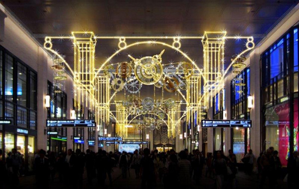 梅田阪急ビル1F(阪急百貨店うめだ本店前)の南北コンコースでは、光で駅空間を表現する新たなクリスマス・イルミネーション「0号線のPLATFORM」を開催。過去3年にわたって実施してきた内容が一新され、「過去と未来を結ぶ出発点」をテーマにしたイベントとして展開される。シンプルな光色のLEDで表現した列柱がプラットフォームを想起させ、列車の出発を告げる時計の歯車部分をイメージしたパーツはゴールド/アンバー/プラチナ色の美しいLEDで表現。合計で約10万球のLED電球が使用されている。