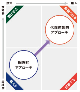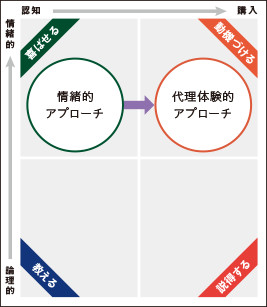 認知獲得段階での情緒的アプローチと論理的アプローチ、検討段階での代理体験型アプローチと説得型アプローチ、この4つのアプローチ方法を組み合わせることにより、商品やサービスの特性に合わせて、認知から購買にいたるストーリーを組み立てることができます。例を見てみましょう。