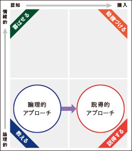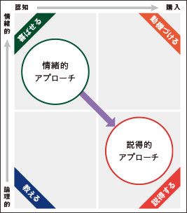 まず、見込客との最初の接触となる認知段階ですが、情緒的にアプローチする方法と、論理的にアプローチする方法のふたつがあります。自動車を例に挙げると、フェラーリなどの高級車は「格好よい」「憧れ」といった情緒的アプローチが適していますが、プリウスなどの新しい考え方の車には「環境にやさしい」「燃費がよい」といった論理的アプローチのほうが適切といった形です。