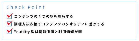 以下の4つの型は、コンテンツを考える切り口として使えます。料理と同じく、同じ素材を使っても調理方法次第でおいしさは大きく変わるもの。手法を知って、適切な手段を選択できるようになりましょう。