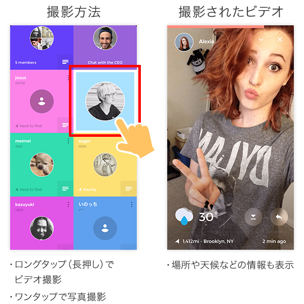 まずはメインの機能であるビデオメッセージを送りたい場合、送りたい友人のサムネイルを指で長押しする。サムネイルを触っている間だけ録画され、指を離すと送信されると言った感じだ。