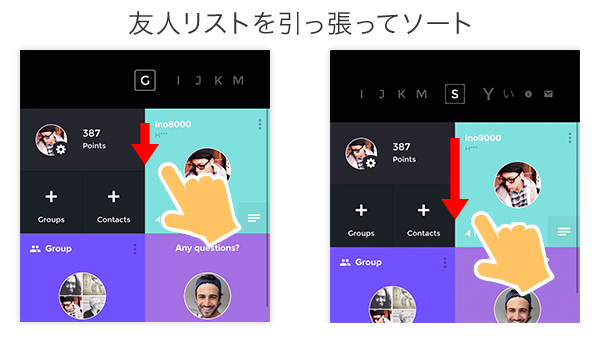 さらに、このアプリに見られる珍しいUIの表現として、友人リストのソート方法が挙げられる。タイル状のリストは面積を使うため、一見リストの件数が増えるとスクロールで友人を探し難いように思える。