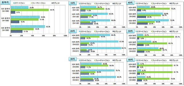 総務省が発表した「平成26年情報通信メディアの利用時間と情報行動に関する調査 調査趣旨・概要統計」によると、2014年から2016年にかけて、調査対象の10代から60代まで全年代を通してスマホの普及率が上昇傾向にあることが確認された(表1)。
