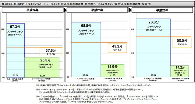 また年々、使用頻度も使用時間も増加傾向にあり。2016年の1日平均利用時間は「約70分」(表2)。24時間のうち1時間はスマホを見ている計算になる。もちろんこれは年代を問わず全ユーザー数に対する平均値なので、若年層はもっとスマホを利用している計算になるだろう。