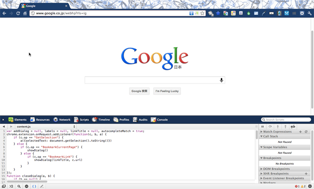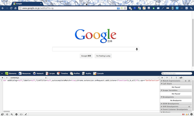 まずはChromeのデベロッパーツールだ。起動はツールバー右端のレンチアイコンからツール→デベロッパーツールで起動できる。デベロッパーツールはChromeの元になっているWebKitのWebインスペクタを改良したもので、WebKitにはない多くの機能が搭載されている。筆者の感覚ではJavaScript関連のエラーや警告がWebKitより詳細なのと、多彩なブレークポイント(http://code.google.com/intl/ja/chrome/devtools/docs/scripts-breakpoints.html)が、XHR関連のデバッグ時などに便利な気がしている。