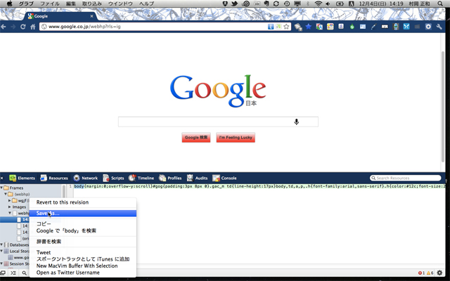このCSSの変更履歴は保存されており、変更したCSSを書き出すことができる。保存のやり方は、まずMatched CSS RulesのCSS宣言の右側にあるCSSへのリンクをクリックする。するとリソースタブに移動し、該当のCSSが表示される。左側パネルからCSSファイル名の三角マークをクリックし、最新のリビジョン(時刻で記載)を右クリックして「Save As」を選択する。(※画像: 変更したCSSを書きだす)既存のCSSファイルを上書きするのではなく別名のCSSファイルとして書きだすので、Dreamweaverなどに比べて若干直感的でないが、Chromeで直接結果表示を確認しながら編集が行えるのは魅力だ。
