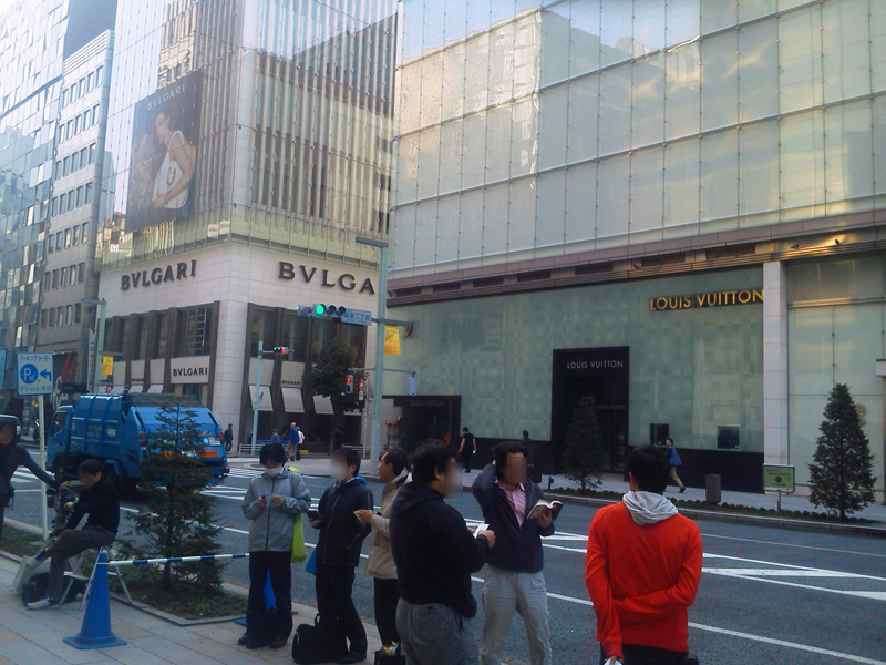 (6:50)銀座到着 (6:50)ソフトバンク表参道店前。すでに大勢の人が並んでいる