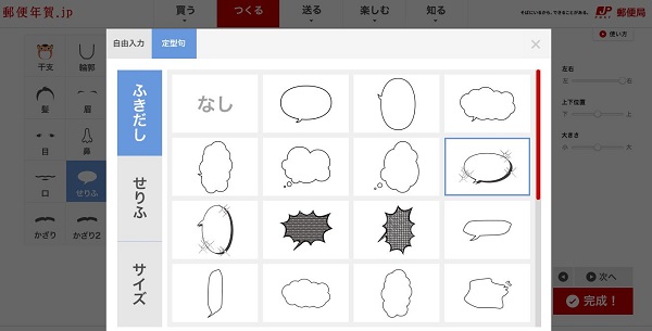 フリーから定型文まで、自分の作成した似顔絵に効果的なセリフを作成することができる。また、この干支似顔絵作成ツールには遊び心もあふれている。作成したキャラクターに自由にセリフを付け加えることができるという点だ。セリフは自由につけることもできるが、考えるのが面倒な場合は定型句もあるので、そちらからの選択も可能。ふきだしもいくつかの種類があり、一般的なものから、漫画調のもの、少し照れた雰囲気が入っているものまでさまざまな種類があるのでおもしろい。