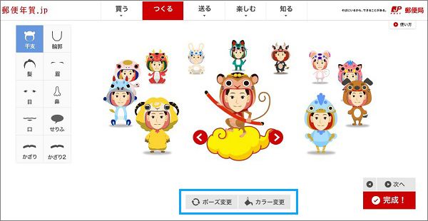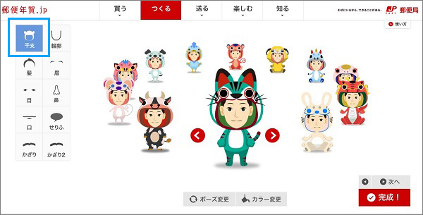 画面中央下にある「ポーズ変更」、「カラー変更」からは、かぶりもののデザインの変更ができる。干支が12種類全て用意されているということはお分かりいただけたと思うが、実は干支のかぶりもの自体のデザインもいくつか用意されている。2015年11月時点だとデザイン数はポーズ、カラーそれぞれ一つの干支につき3~5種類ほどだ。例えば、2016年の申の干支であると、ポーズ数は5つ、カラーが3種類であるから、申のかぶりものだけでも15種類のカスタマイズができることになる。