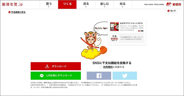 作成した画像は、年賀状素材として利用できるほか、LINEやSNSの投稿などにも使用することができる。作成した似顔絵だが、もちろんダウンロードして年賀状の素材として使用することができる。日本郵政の年賀状WEB作成ツール「はがきデザインキット2016」にも連動しているので、そちらで使ってみるのも良いだろう。年賀状はもちろんのこと、注目したいのがLINEでの使用である。近年若者の間などでは、LINEやメールなどで年始めの挨拶をすることも多くなってきた。LINE用にダウンロードしておけば、LINEでの「あけおめメール」でも使用することができる。個性的なデザインが目を惹くことだろう。