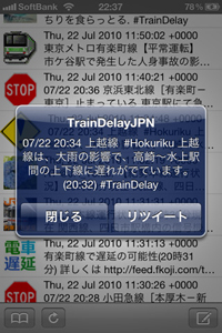 遅延情報を見たりつぶやいたりできるTwitterクライアント。Twitter上から遅延情報を検索して表示する。