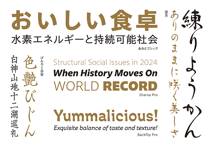 和文フォントのほか、軽快で遊び心のある欧文書体「Backflip Pro」も追加。同じく欧文書体では、「あおとゴシック」との併記利用にも最適な“ヒューマニストサンセリフ”の「Sharoa Pro」も追加されている。