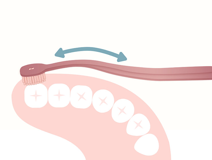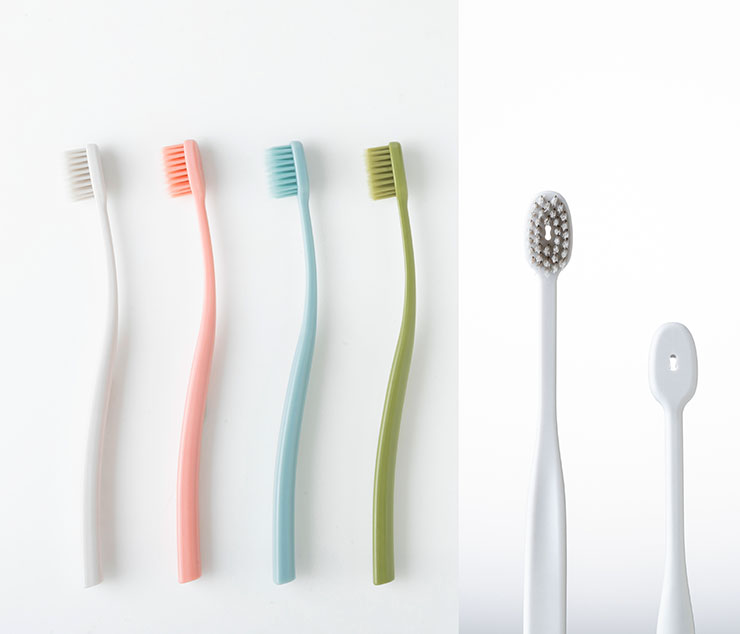「奥歯のウラまで届く穴あきハブラシ」は、乾きやすいようブラシの真ん中に穴が開いている。細菌の繁殖を抑えるために工夫されたデザイン。奥歯のウラまで磨きやすいよう、スリムで大きなカーブ柄となっている。口の中での歯ブラシの動き方、ブラシの持ち方を研究することで実現した形状だ。極太グリップなので安定して握りやすい。