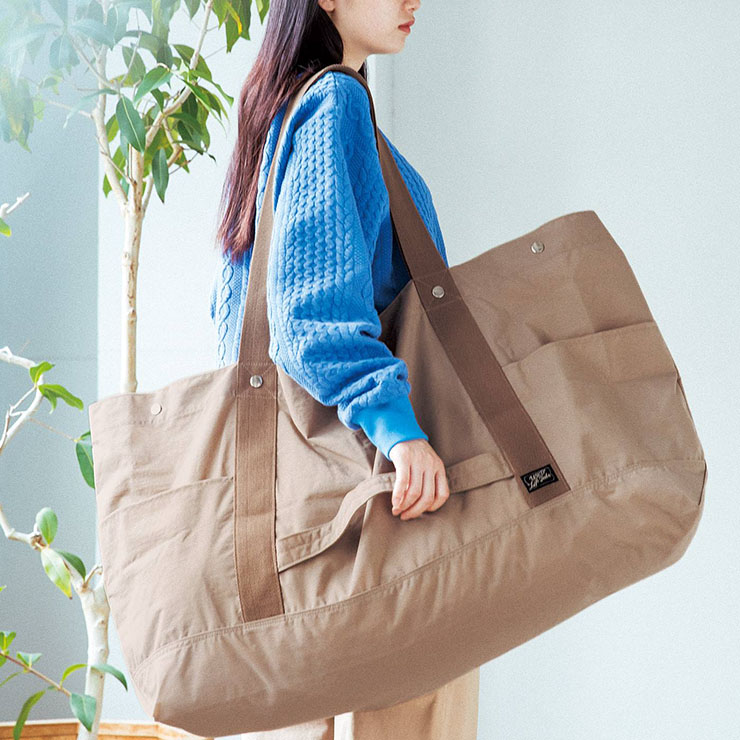 「長い荷物も持ち運びOK たたむと小さくなる撥水加工の細長ビッグナイロントートバッグ」は、コンパクトにたためる大きなバッグ。クリーニングやコインランドリー、キャンプなど、かさばる荷物や、持ち運びに困るような長めのものを持ち運ぶ際に役立つ。重い荷物を運ぶサポートとして、補助ハンドルがサイド部分に付いている。内と外にポケットが付いている。生地には撥水加工を施している。