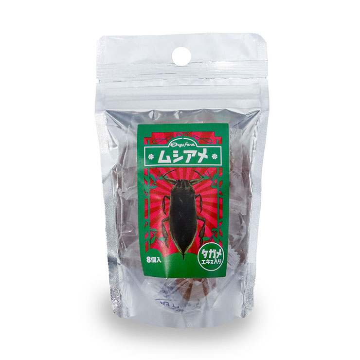 「ムシアメ(タガメエキス入り)」の内容量は8個。原材料名は砂糖(国内製造)、水飴、タガメエキス/酸味料、香料、カラメル色素となっている。