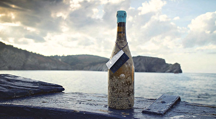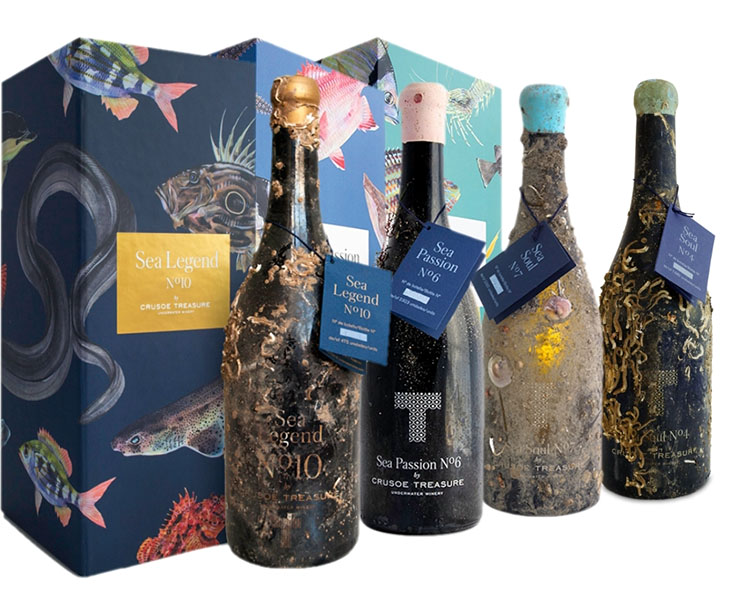 「海底熟成ワイン」は、バスクの海で熟成したワイン。ボトルには藻類や貝殻の模様が施されている。海で熟成する過程で付いた模様なので1つずつオリジナルで、海底熟成時に同じケージ内にあったボトルであっても模様は全て異なっている。