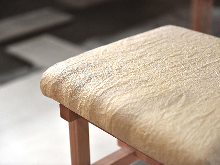 本シリーズの商品は、高さ45cmの「紙木の椅子」と、高さ36.5cmの「紙木365」の2種類に分けられ、いずれもスツール型やベンチ型(大・小)のサイズ違いと「生成色/ヒノキ材」「柿渋/スギ材」の組み合わせを用意。新モデルとしてのリニューアルについては、和紙に裏打ちを施すことで裁縫が可能となり、それによって和紙の強度が増したことなどもポイントとして挙げられている。