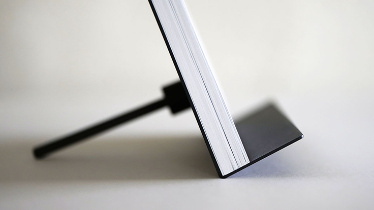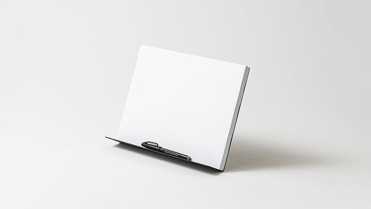 1本の棒で背面を支えるミニマルな設計で、紙のほかにペンも置いておくことが可能。思い付いたアイデアをすぐに書ける。上から1枚ずつ紙を取りやすいように、鉄板のL字曲げ角度はやや鋭角にデザイン。大阪の町工場「藤田金属」の職人によって1つずつ丁寧に製造され、表面にはざらついた粉体塗装が施されている。