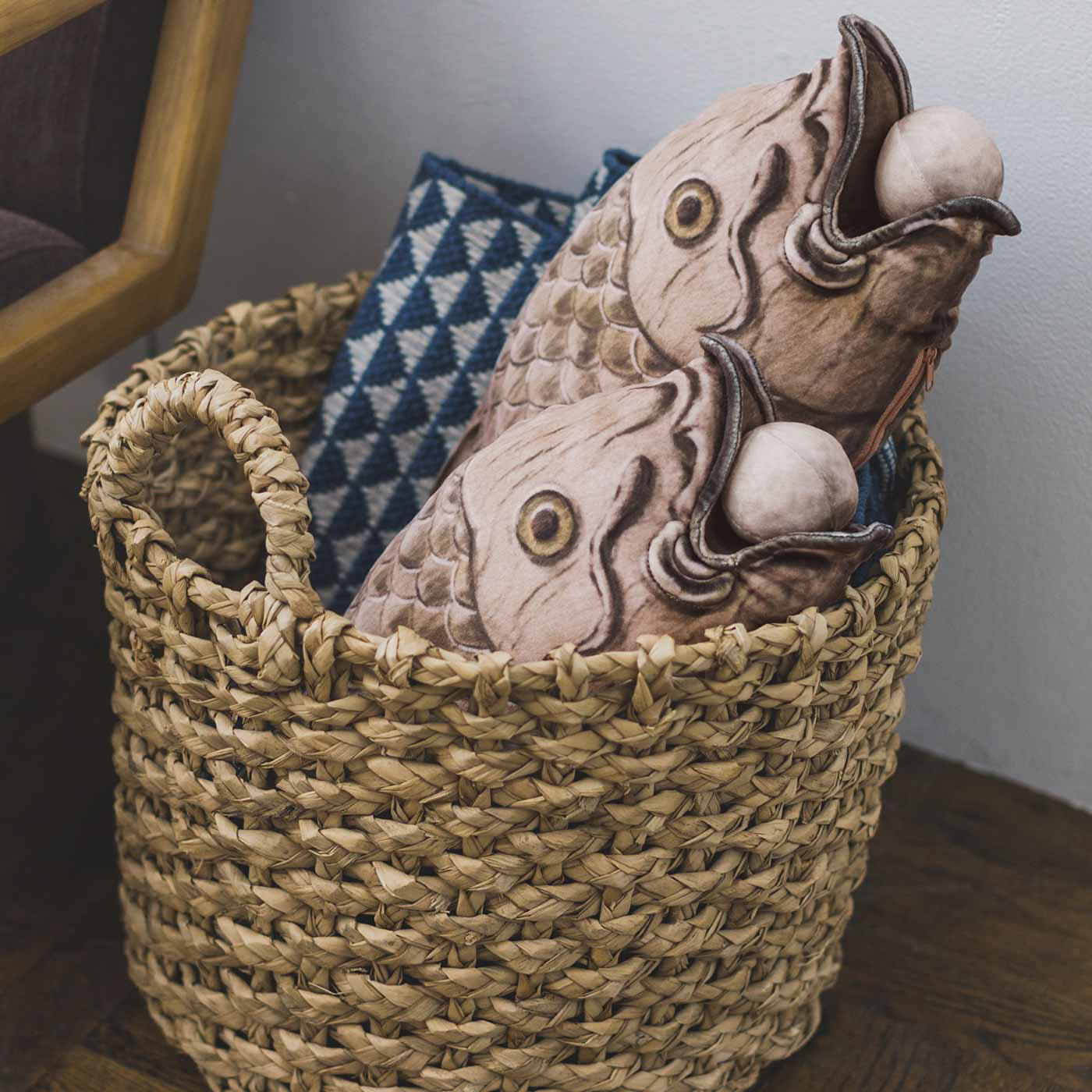「ふかふかあたたか 魚板(ぎょばん)クッション」のサイズは縦約20cm×横約50cm×厚さ約10cm、リールの長さは最長で約30cm。