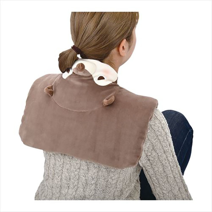 「ショルダーウォーマー」は、動物が体をだらんと伸ばして肩に巻き付いたようなデザイン。レンジで2分ほど温めて使える。肩に乗せるだけなので、気軽に使える”温活”グッズだ。
