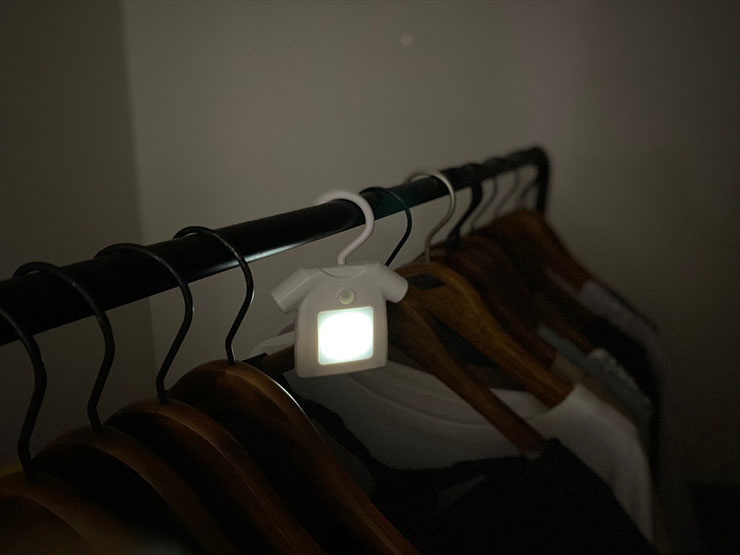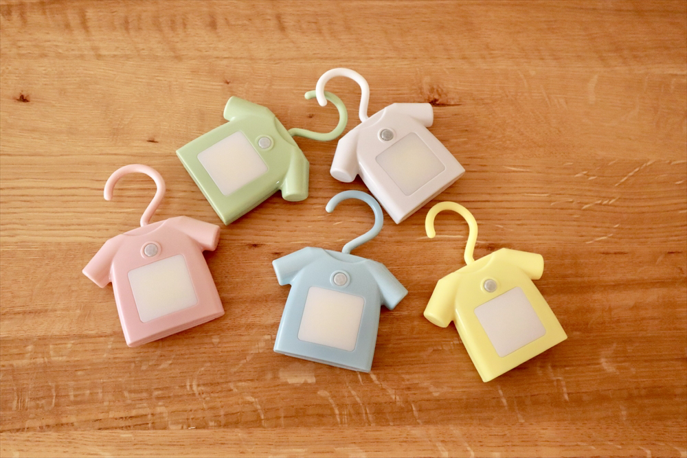 「人感センサー付きクローゼットライト T-shirt」は、クローゼットや階段などのちょっとした隙間を照らすTシャツ型ライト。フックを利用して、Tシャツを掛けるように設置できる。背面にはマグネットが付いているので、貼り付けて使用可能。人感センサー付きで、動きを感知したときだけ点灯するため、消し忘れの心配がない。